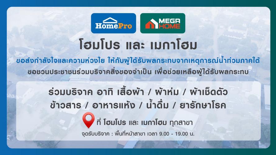 จากสถานการณ์น้ำท่วมในหลายพื้นที่ของภาคใต้ ที่ส่งผลให้หลายครอบครัวต้องอพยพออกจากบ้านหนีน้ำ และขาดแคลนสิ่งของจำเป็นในชีวิตประจำวัน โฮมโปรและเมกาโฮม ขอส่งกำลังใจและความห่วงใยไปยังผู้ที่ได้รับผลกระทบ พร้อมเดินหน้าโครงการ "โฮมโปร เมกาโฮม ห่วงใยร่วมใจฟื้นฟูบ้าน" เพื่อเป็นสะพานแห่งน้ำใจ เชื่อมต่อระหว่างทุกคนที่อยากส่งต่อความช่วยเหลือ กับผู้ที่กำลังเผชิญความยากลำบาก ผ่านการเปิดบูธรับบริจาคสิ่งของจำเป็นทุกสาขาทั่วประเทศ ควบคู่กับระดมความช่วยเหลืออย่างเร่งด่วน เพื่อบรรเทาความเดือดร้อนให้กับผู้ประสบภัยในภาคใต้โดยเร็วที่สุด