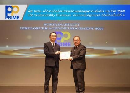 พีพี ไพร์ม คว้ารางวัล Sustainability Disclosure Acknowledgement ประจำปี 2568 ต่อเนื่องเป็นปีที่ 4