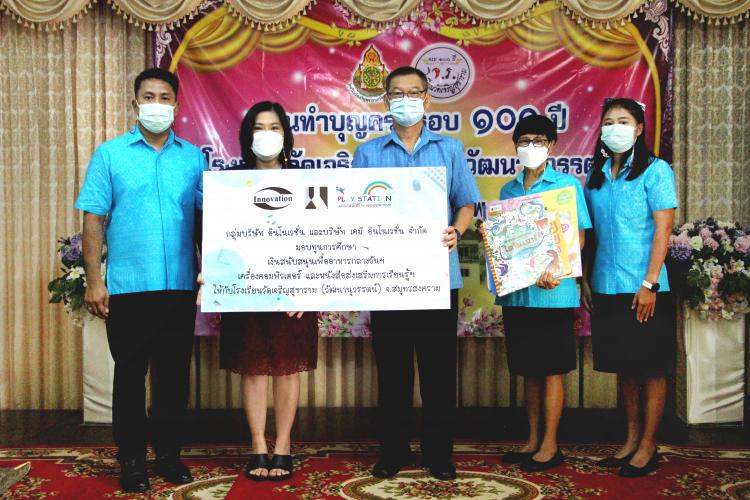 คุณกุลวดี ธำรงค์ธนกิจ รองประธานกรรมการอาวุโส ด้านบริหารทรัพยากรมนุษย์และจัดการ กลุ่มบริษัทอินโนเวชั่น เข้ามอบงบสนับสนุนและอุปกรณ์การศึกษาในโครงการ Play Station มอบหนังสือ มอบอนาคต ได้แก่ ทุนการศึกษานักเรียน 16 ทุน งบสนับสนุนอาหารกลางวัน หนังสือส่งเสริมการเรียนรู้ และเครื่องคอมพิวเตอร์ มูลค่ารวม 60,500 บาท ในงานทำบุญครบ 100 ปี โรงเรียนวัดเจริญสุขาราม (วัฒนานุวรรตน์) ต.บางนกแขวก อ.บางคนที จ.สมุทรสงคราม